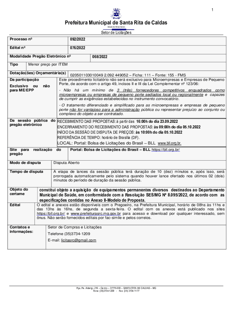1Prefeitura Municipal de Santa Rita de Caldas Estado de Minas GeraisSetor de Licitaes Processo n092/2022Edital n076/2022 068/2022Modalidade Prego Eletrnico n TipoMenor preo por ITEMDotao(es) Oramentria(s)