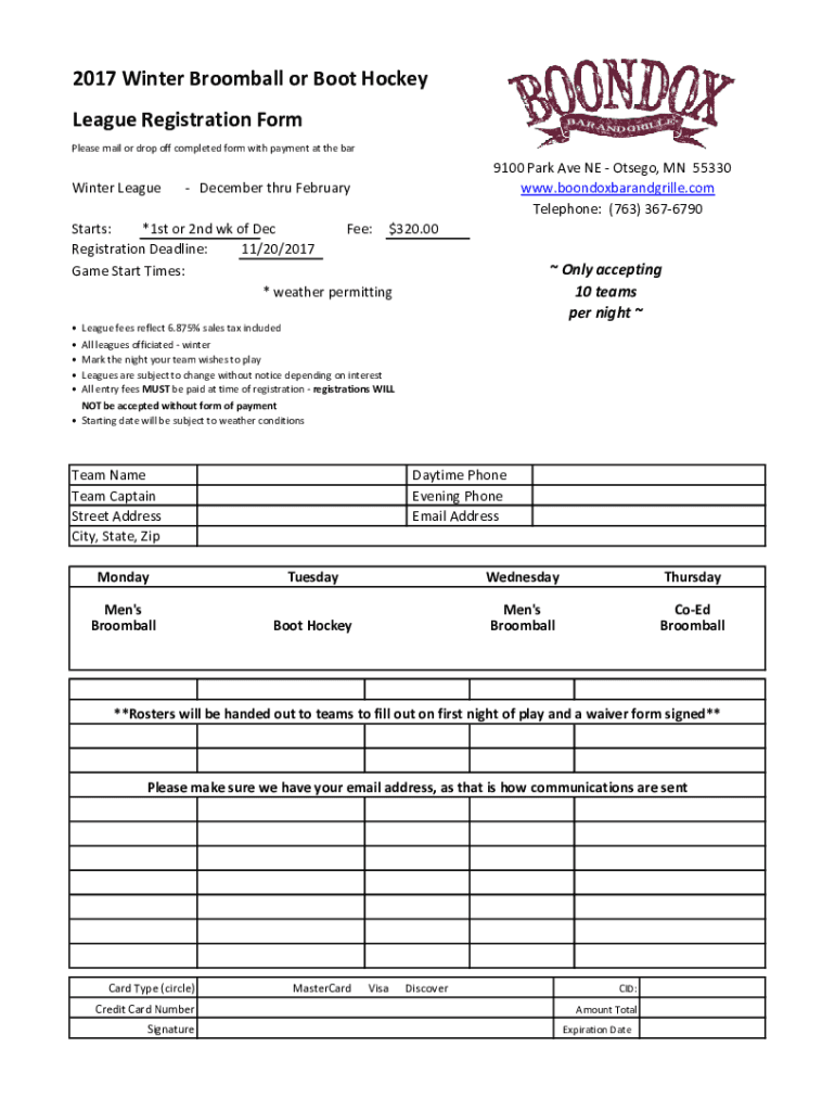2017 Winter Broomball or Boot Hockey League Registration Form Please mail or drop off completed form with payment at the barWinter League9100 Park Ave NE Otsego, MN 55330 www.boondoxbarandgrille.com