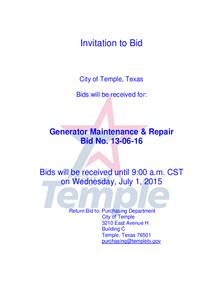 Invitation to BidCity of Temple, Texas Bids will be received for:Generator Maintenance & Repair Bid No. 130616Bids will be received until 9:00 a.m. CST on Wednesday, July 1, 2015Return Bid to: Purchasing