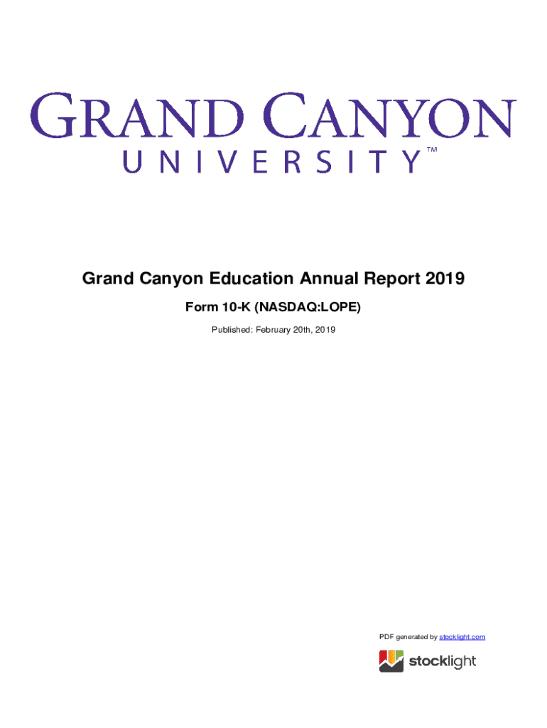 Grand Canyon Education Annual Report 2019 Form 10K (NASDAQ:LOPE) Published: February 20th, 2019PDF generated by stocklight.comUNITED STATES SECURITIES AND EXCHANGE COMMISSION Washington, D.C. 20549Form