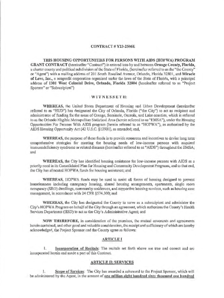 CONTRACT# V232506ETHIS HOUSING OPPORTUNITillS FOR PERSONS WITH AIDS (HOPWA) PROGRAM GRANT CONTRACT (hereinafter \"Contract\") is entered into by and between Orange County, Florida, a charter county
