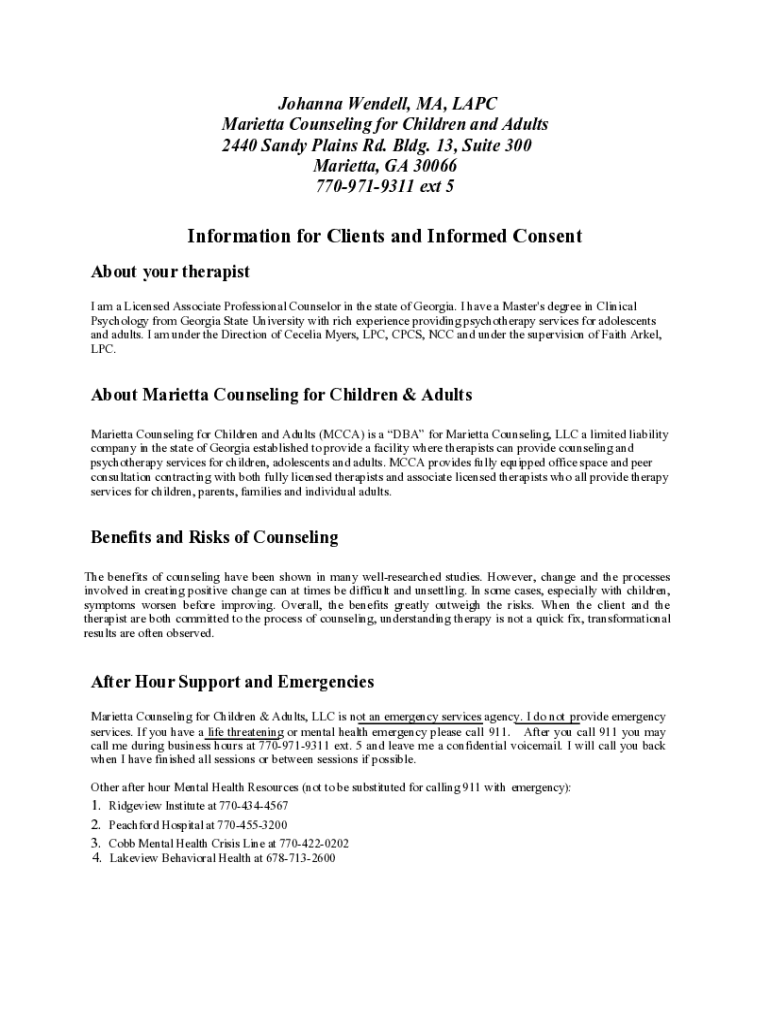 Johanna Wendell, MA, LAPC Marietta Counseling for Children and Adults 2440 Sandy Plains Rd. Bldg. 13, Suite 300 Marietta, GA 30066 7709719311 ext 5Information for Clients and Informed Consent About