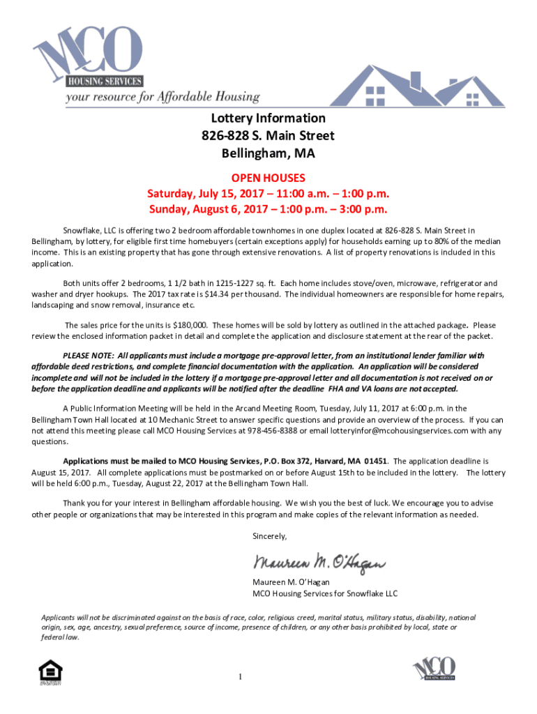 Lottery Information 826828 S. Main Street Bellingham, MA OPEN HOUSES Saturday, July 15, 2017 11:00 a.m. 1:00 p.m. Sunday, August 6, 2017 1:00 p.m. 3:00 p.m. Snowflake, LLC is offering two 2 bedroom