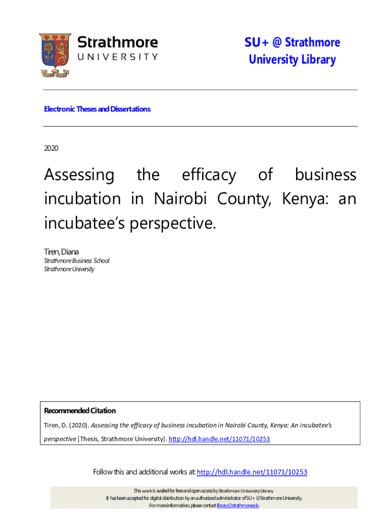 SU+ @ Strathmore University LibraryElectronic Theses and Dissertations2020Assessing the efficacy of business incubation in Nairobi County, Kenya: an incubatees perspective. Tiren, DianaStrathmore