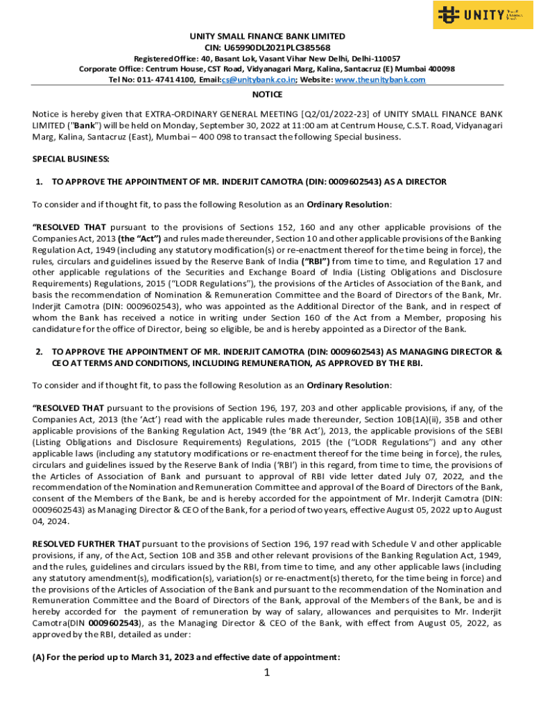 UNITY SMALL FINANCE BANK LIMITED CIN: U65990DL2021PLC385568Registered Office: 40, Basant Lok, Vasant Vihar New Delhi, Delhi110057 Corporate Office: Centrum House, CST Road, Vidyanagari Marg, Kalina,