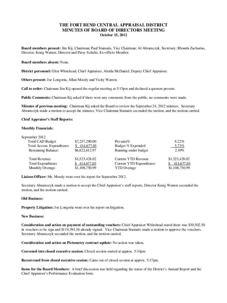 THE FORT BEND CENTRAL APPRAISAL DISTRICT MINUTES OF BOARD OF DIRECTORS MEETING October 15, 2012Board members present: Jim Kij, Chairman; Paul Stamatis, Vice Chairman; Al Abramczyk, Secretary; Rhonda