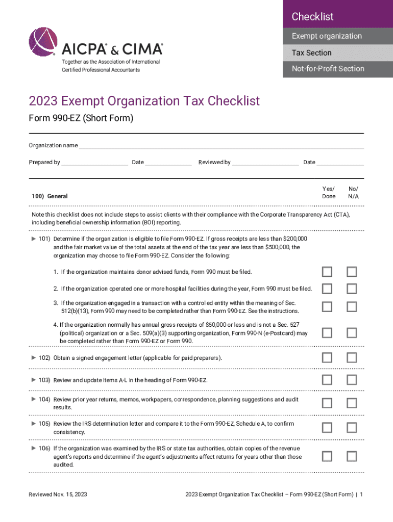 Checklist Exempt organization Tax Section NotforProfit Section2023 Exempt Organization Tax Checklist Form 990EZ (Short Form) Organization name Prepared byDateReviewed byDateYes/ Done100)GeneralNo/