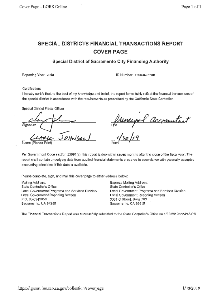 Cover Page LGRS OnlinePage 1of1) SPECIAL DISTRICTS FINANCIAL TRANSACTIONS REPORT COVER PAGE Special District of Sacramento City Financing Authority Reporting Year: 2018ID Number: 12503405700Certification: