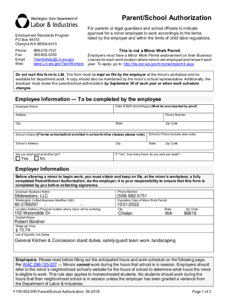 Parent/School Authorization For parents or legal guardians and school officials to indicate approval for a minor employee to work accordingly to the terms listed by the employer and within the limits