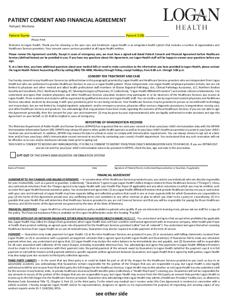 PATIENT CONSENT AND FINANCIAL AGREEMENT Kalispell, MontanaPatient Name:Patient DOB:Please PrintWelcome to Logan Health. Thank you for choosing us for your care and treatment. Logan Health is an integrated