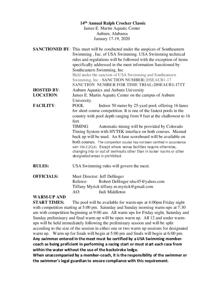 14th Annual Ralph Crocker Classic James E. Martin Aquatic Center Auburn, Alabama January 1719, 2020 SANCTIONED BY: This meet will be conducted under the auspices of Southeastern Swimming , Inc. of