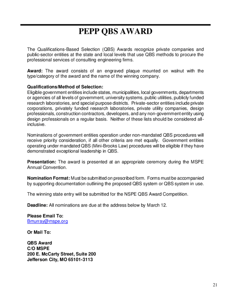 PEPP QBS AWARD The QualificationsBased Selection (QBS) Awards recognize private companies and publicsector entities at the state and local levels that use QBS methods to procure the professional services