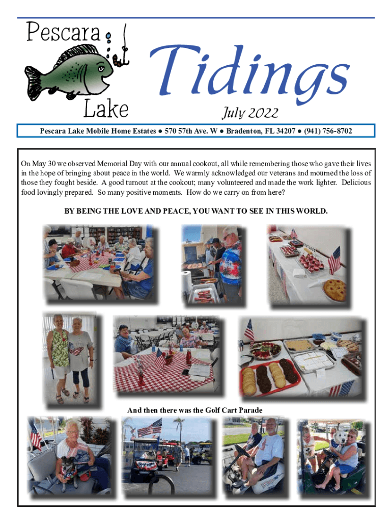 Tidings July 2022Pescara Lake Mobile Home Estates 570 57th Ave. W Bradenton, FL 34207 (941) 7568702On May 30 we observed Memorial Day with our annual cookout, all while remembering those who gave