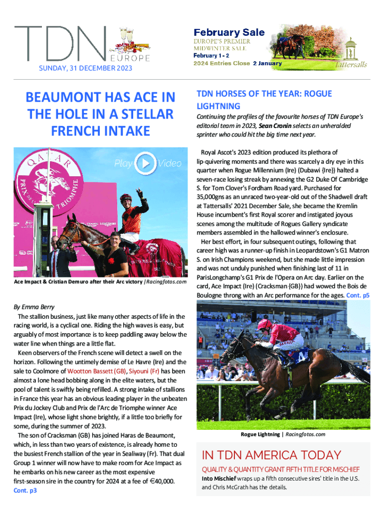 SUNDAY, 31 DECEMBER 2023BEAUMONT HAS ACE IN THE HOLE IN A STELLAR FRENCH INTAKEAce Impact & Cristian Demuro after their Arc victory |Racingfotos.comBy Emma Berry The stallion business, just like many