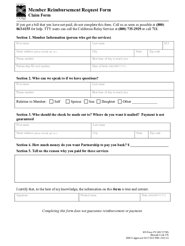 Member Reimbursement Request Form Claim FormIf you got a bill that you have not paid, do not complete this form. Call us as soon as possible at (800) 8634155 for help. TTY users can call the California