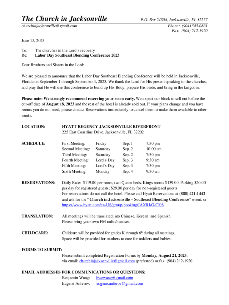 The Church in JacksonvilleP.O. Box 24804, Jacksonville, FL 32257 Phone: (904) 3450861 Fax: (904) 2121920churchinjacksonville@gmail.comJune 15, 2023 To: Re:The churches in the Lords recovery Labor