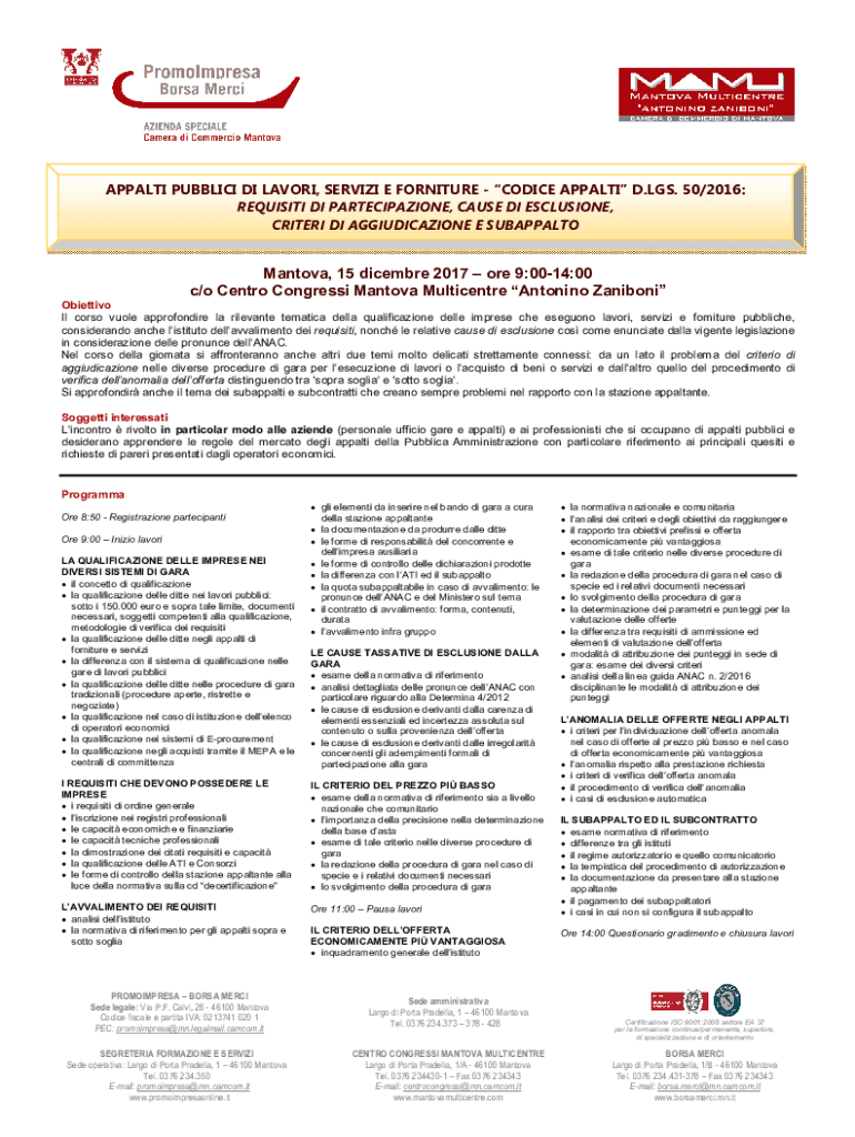 APPALTI PUBBLICI DI LAVORI, SERVIZI E FORNITURE CODICE APPALTI D.LGS. 50/2016: REQUISITI DI PARTECIPAZIONE, CAUSE DI ESCLUSIONE, CRITERI DI AGGIUDICAZIONE E SUBAPPALTOMantova, 15 dicembre 2017 ore