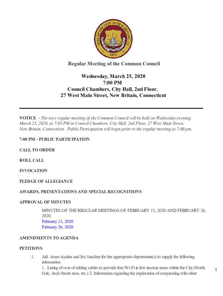 Regular Meeting of the Common Council Wednesday, March 25, 2020 7:00 PM Council Chambers, City Hall, 2nd Floor, 27 West Main Street, New Britain, ConnecticutNOTICE The next regular meeting of the