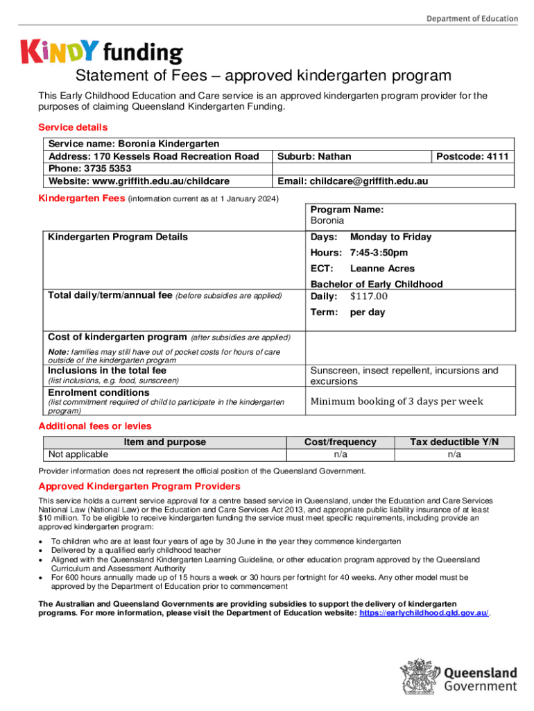 Statement of Fees approved kindergarten program This Early Childhood Education and Care service is an approved kindergarten program provider for the purposes of claiming Queensland Kindergarten Funding.