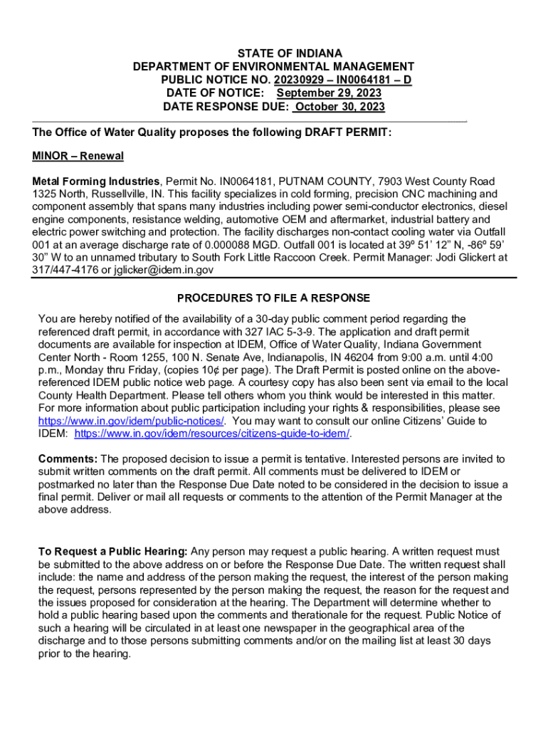 STATE OF INDIANA DEPARTMENT OF ENVIRONMENTAL MANAGEMENT PUBLIC NOTICE NO. 20230929 IN0064181 D DATE OF NOTICE: September 29, 2023 DATE RESPONSE DUE: October 30, 2023 ___The Office of Water Quality