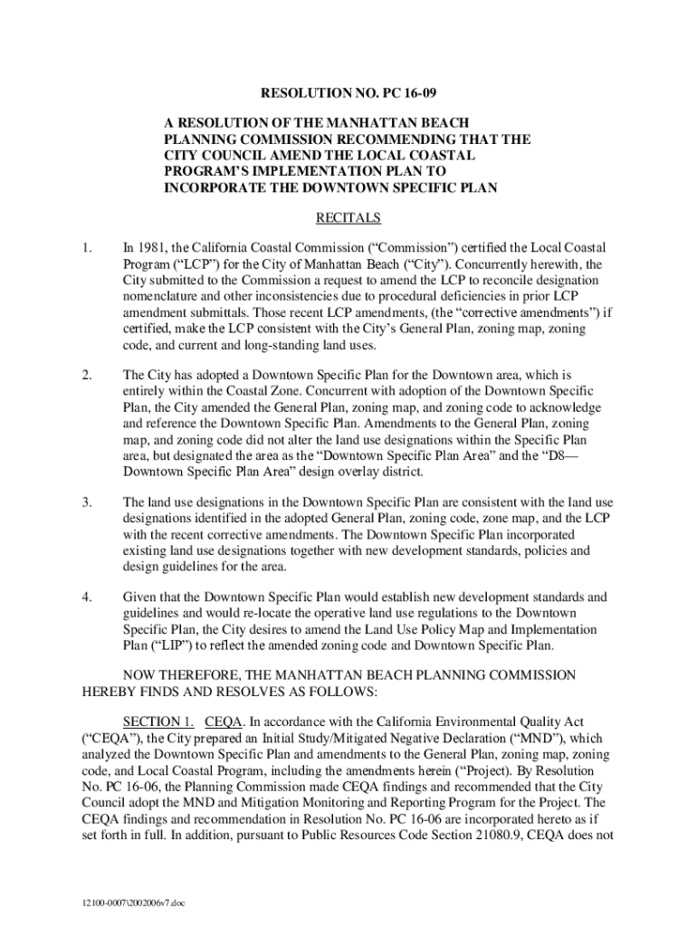 RESOLUTION NO. PC 1609 A RESOLUTION OF THE MANHATTAN BEACH PLANNING COMMISSION RECOMMENDING THAT THE CITY COUNCIL AMEND THE LOCAL COASTAL PROGRAMS IMPLEMENTATION PLAN TO INCORPORATE THE DOWNTOWN SPECIFIC