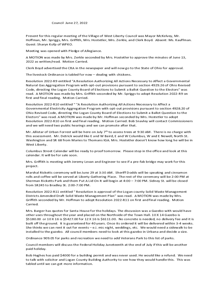 Council June 27, 2022Present for this regular meeting of the Village of West Liberty Council was Mayor McKelvey, Mr. Hoffman, Mr. Spriggs, Mrs. Griffith, Mrs. Hostetler, Mrs. Zerkle, and Clerk Boyd.