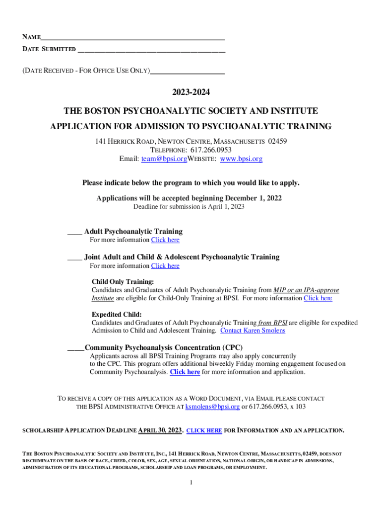 NAME DATE SUBMITTED ___(DATE RECEIVED FOR OFFICE USE ONLY)20232024 THE BOSTON PSYCHOANALYTIC SOCIETY AND INSTITUTE APPLICATION FOR ADMISSION TO PSYCHOANALYTIC TRAINING 141 HERRICK ROAD, NEWTON CENTRE,