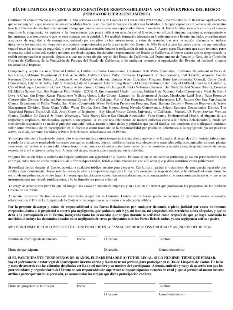 DA DE LIMPIEZA DE COSTAS 2013 EXENCIN DE RESPONSABILIDAD Y ASUNCIN EXPRESA DEL RIESGO (POR FAVOR LEER ATENTAMENTE) Confirmo mi consentimiento a lo siguiente: 1. Mis servicios en el Da de Limpieza