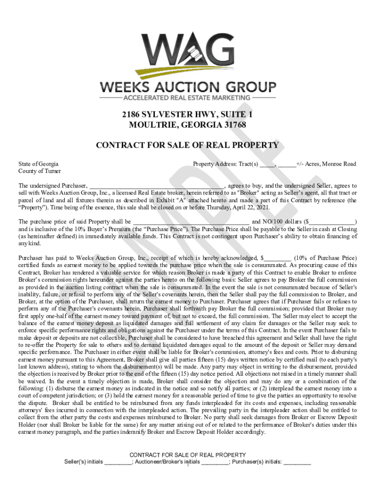 2186 SYLVESTER HWY, SUITE 1 MOULTRIE, GEORGIA 31768 CONTRACT FOR SALE OF REAL PROPERTY State of Georgia County of TurnerProperty Address: Tract(s) ___, ___+/ Acres, Monroe RoadThe undersigned Purchaser,