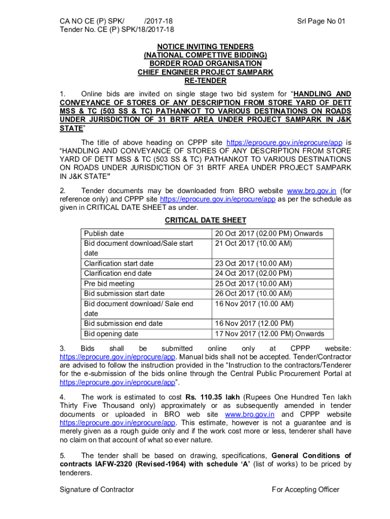 CA NO CE (P) SPK/ /201718 Tender No. CE (P) SPK/18/201718Srl Page No 01NOTICE INVITING TENDERS (NATIONAL COMPETTIVE BIDDING) BORDER ROAD ORGANISATION CHIEF ENGINEER PROJECT SAMPARK RETENDER 1. Online