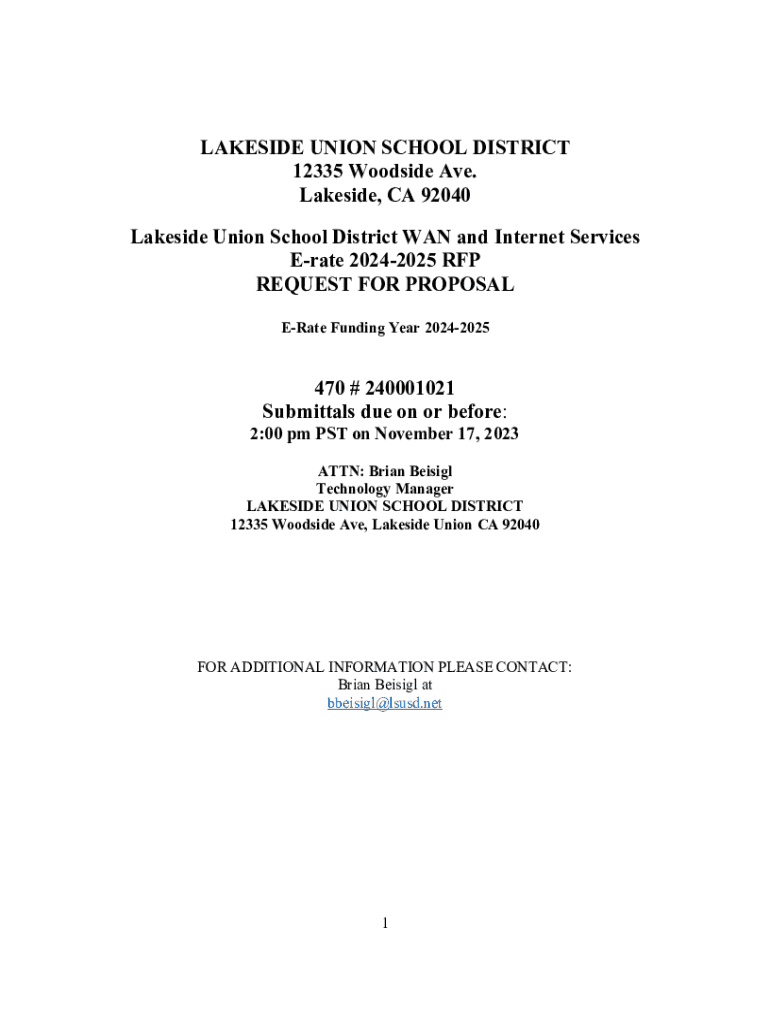 LAKESIDE UNION SCHOOL DISTRICT 12335 Woodside Ave. Lakeside, CA 92040 Lakeside Union School District WAN and Internet Services Erate 20242025 RFP REQUEST FOR PROPOSAL ERate Funding Year 20242025470