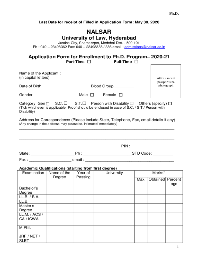 Ph.D. Last Date for receipt of Filled in Application Form: May 30, 2020NALSAR University of Law, Hyderabad Justice City, Shameerpet, Medchal Dist. 500 101 Ph : 040 23498362 Fax: 040 23498385 / 386