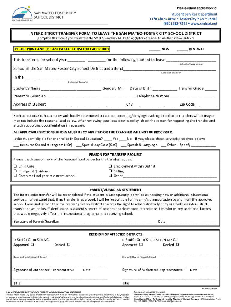 Please return application to:Student Services Department 1170 Chess Drive Foster City CA 94404 (650) 3127345 www.smfcsd.netINTERDISTRICT TRANSFER FORM TO LEAVE THE SAN MATEOFOSTER CITY SCHOOL DISTRICT