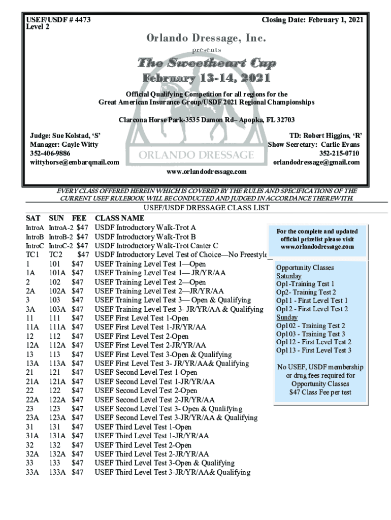 USEF/USDF # 4473 Level 2Closing Date: February 1, 2021Orlando Dressage, Inc. presentsThe Sweetheart Cup February 1314, 2021 Official Qualifying Competition for all regions for the Great American Insurance