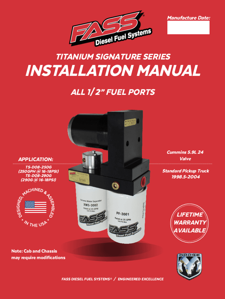 Manufacture Date:TITANIUM SIGNATURE SERIESINSTALLATION MANUAL ALL 1/2 FUEL PORTSCummins 5.9L 24 ValveAPPLICATION: TSD08250G (250GPH @ 1618PSI) TSD08290G (290G @ 1618PSI)Standard Pickup Truck 1998.52004LIFETIME