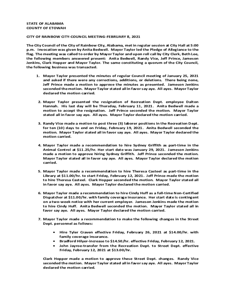 STATE OF ALABAMA COUNTY OF ETOWAH CITY OF RAINBOW CITYCOUNCIL MEETINGFEBRUARY 8, 2021 The City Council of the City of Rainbow City, Alabama, met in regular session at City Hall at 5:00 p.m. Invocation