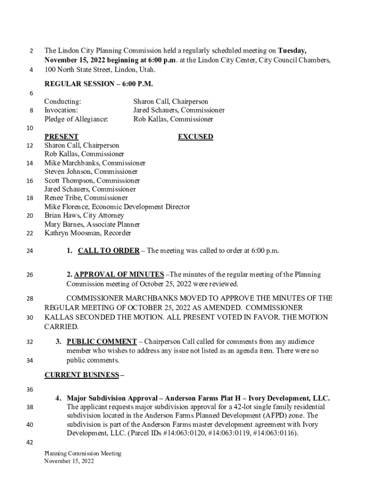 2 4 6 8 10 12 14 16 18 20 22The Lindon City Planning Commission held a regularly scheduled meeting on Tuesday, November 15, 2022 beginning at 6:00 p.m. at the Lindon City Center, City Council Chambers,