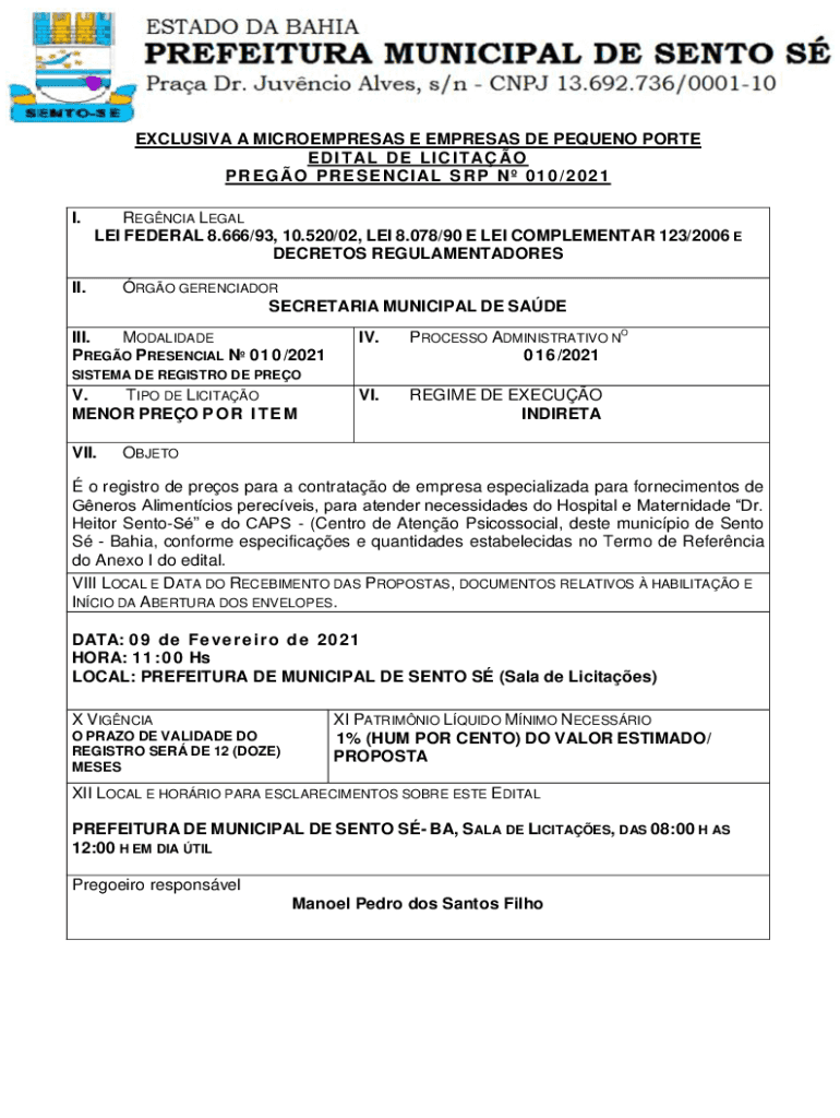 EXCLUSIVA A MICROEMPRESAS E EMPRESAS DE PEQUENO PORTE E D I T AL D E L I C I TA O P R E G O P R E S E NC I AL S R P N 0 1 0 / 2 0 2 1 I.REGNCIA LEGAL LEI FEDERAL 8.666/93, 10.520/02, LEI 8.078/90