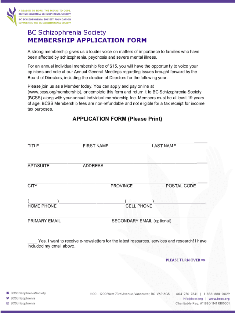 BC Schizophrenia Society MEMBERSHIP APPLICATION FORM A strong membership gives us a louder voice on matters of importance to families who have been affected by schizophrenia, psychosis and severe
