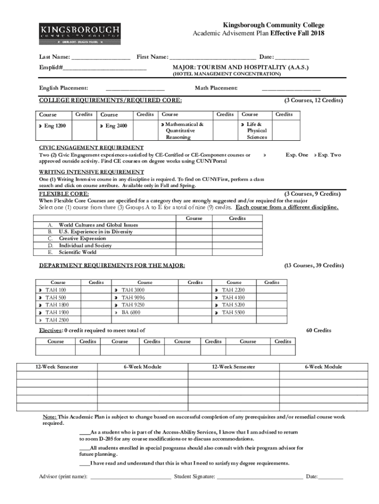 Kingsborough Community College Academic Advisement Plan Effective Fall 2018 Last Name: ___First Name: ___ Date: ___Emplid#___ English Placement:MAJOR: TOURISM AND HOSPITALITY (A.A.S.) (HOTEL MANAGEMENT