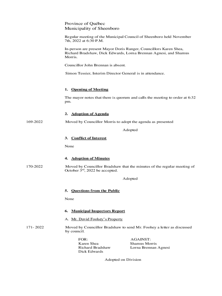 Province of Qubec Municipality of Sheenboro Regular meeting of the Municipal Council of Sheenboro held November 7th, 2022 at 6:30 P.M. Inperson are present Mayor Doris Ranger, Councillors Karen Shea,