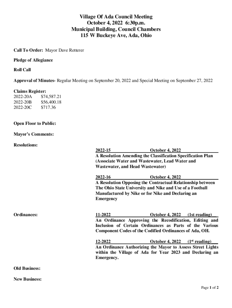 Village Of Ada Council Meeting October 4, 2022 6:30p.m. Municipal Building, Council Chambers 115 W Buckeye Ave, Ada, Ohio Call To Order: Mayor Dave Retterer Pledge of Allegiance Roll Call Approval