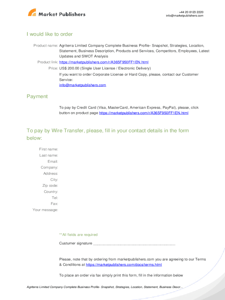 +44 20 8123 2220 info@marketpublishers.comAgriterra Limited Company Complete Business Profile Snapshot, Strategies, Location, Statement, Business Description, Products and Services, Competitors, Employees,