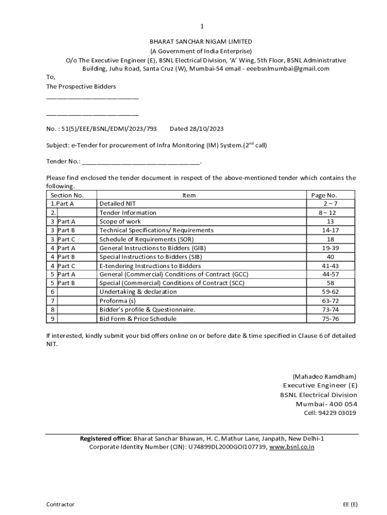 1 BHARAT SANCHAR NIGAM LIMITED (A Government of India Enterprise) O/o The Executive Engineer (E), BSNL Electrical Division, A Wing, 5th Floor, BSNL Administrative Building, Juhu Road, Santa Cruz (W),