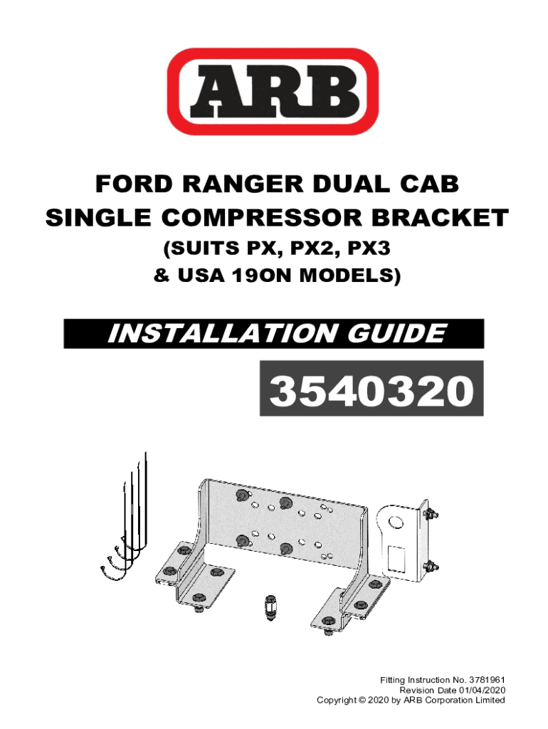 FORD RANGER DUAL CAB SINGLE COMPRESSOR BRACKET (SUITS PX, PX2, PX3 & USA 19ON MODELS)INSTALLATION GUIDE3540320Fitting Instruction No. 3781961 Revision Date 01/04/2020 Copyright 2020 by ARB Corporation