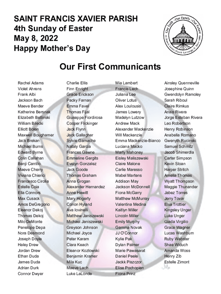 SAINT FRANCIS XAVIER PARISH 4th Sunday of Easter May 8, 2022 Happy Mothers DayOur First Communicants Rachel Adams Violet Ahrens Frank Albi Jackson Bach Maeve Bender Katherine Bersnak Elizabeth Betlinski