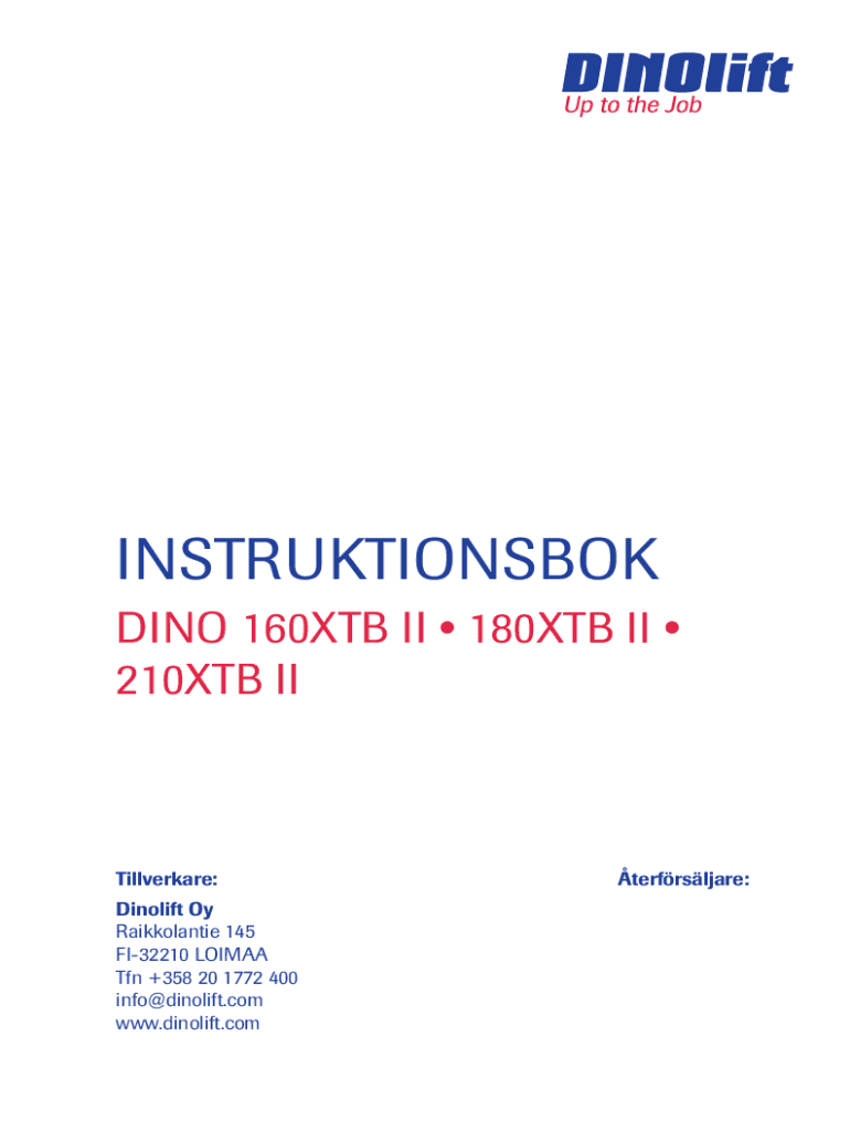 INSTRUKTIONSBOK DINO 160XTB II 180XTB II 210XTB IITillverkare: Dinolift Oy Raikkolantie 145 FI32210 LOIMAA Tfn +358 20 1772 400 info@dinolift.com www.dinolift.comterfrsljare:VERSTTNING AV BRUKSANVISNING