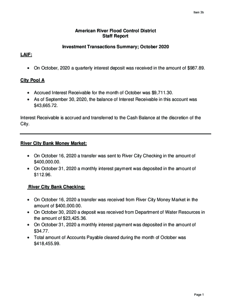 Item 3bAmerican River Flood Control District Staff Report Investment Transactions Summary; October 2020 LAID: On October 2020 a quarterly interest deposit was received in the amount of $987.89. City