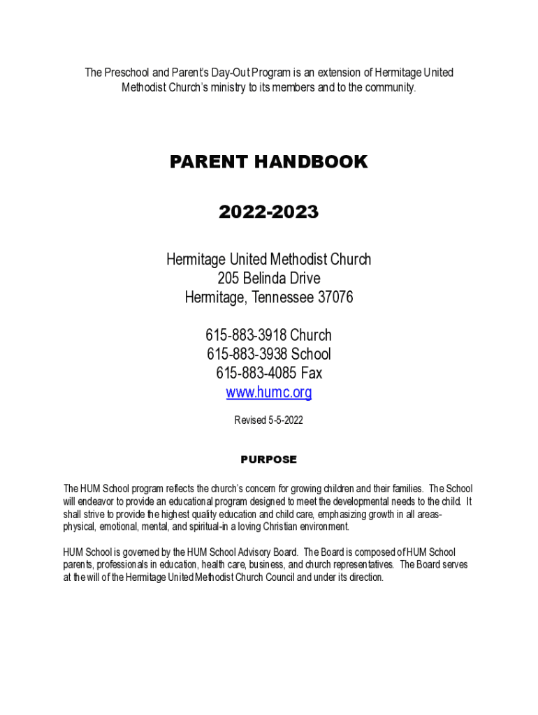 The Preschool and Parents Layout Program is an extension of Hermitage United Methodist Church's ministry to its members and to the community. PARENT HANDBOOK 20222023 Hermitage United Methodist Church