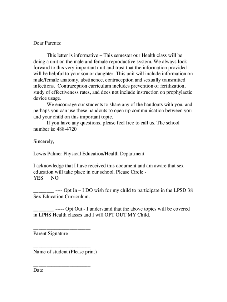 Dear Parents: This letter is informative This semester our Health class will be doing a unit on the male and female reproductive system. We always look forward to this very important unit and trust